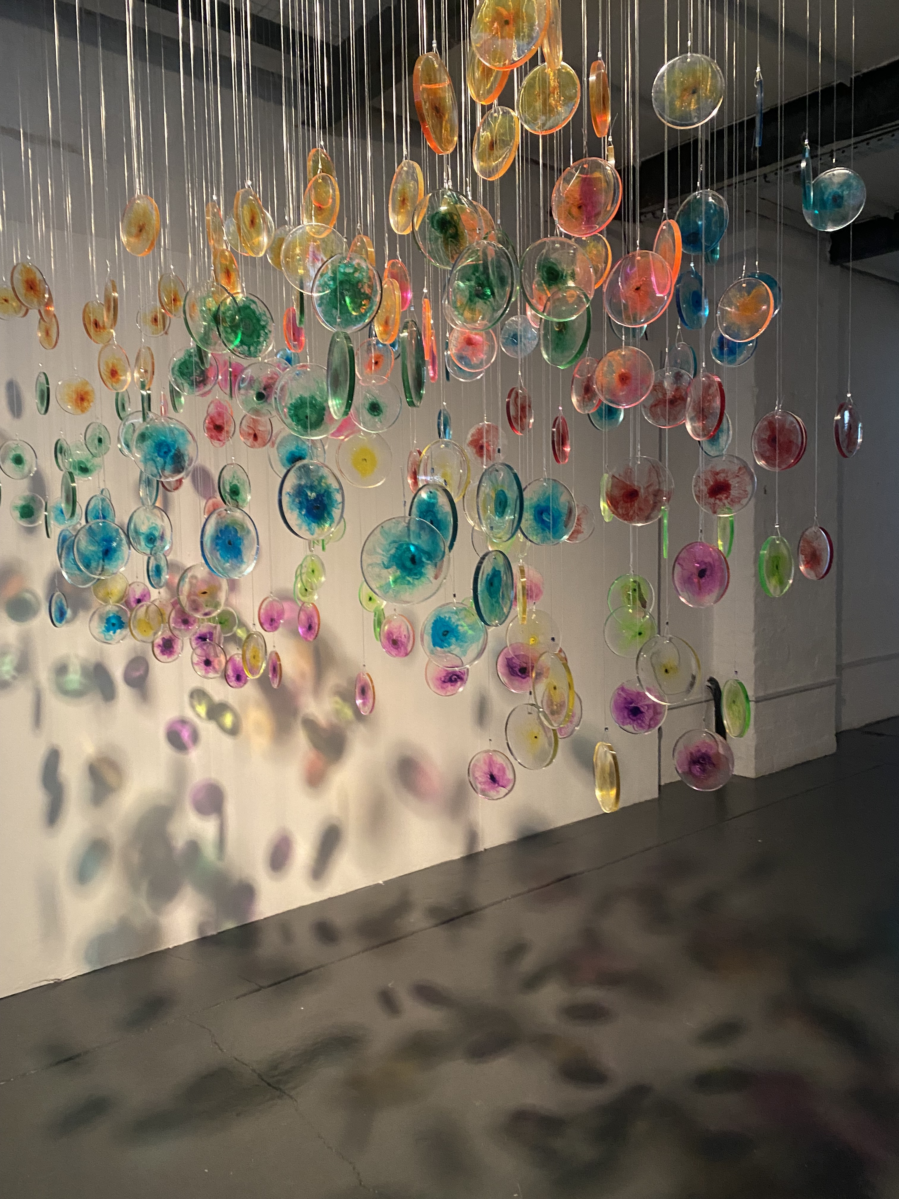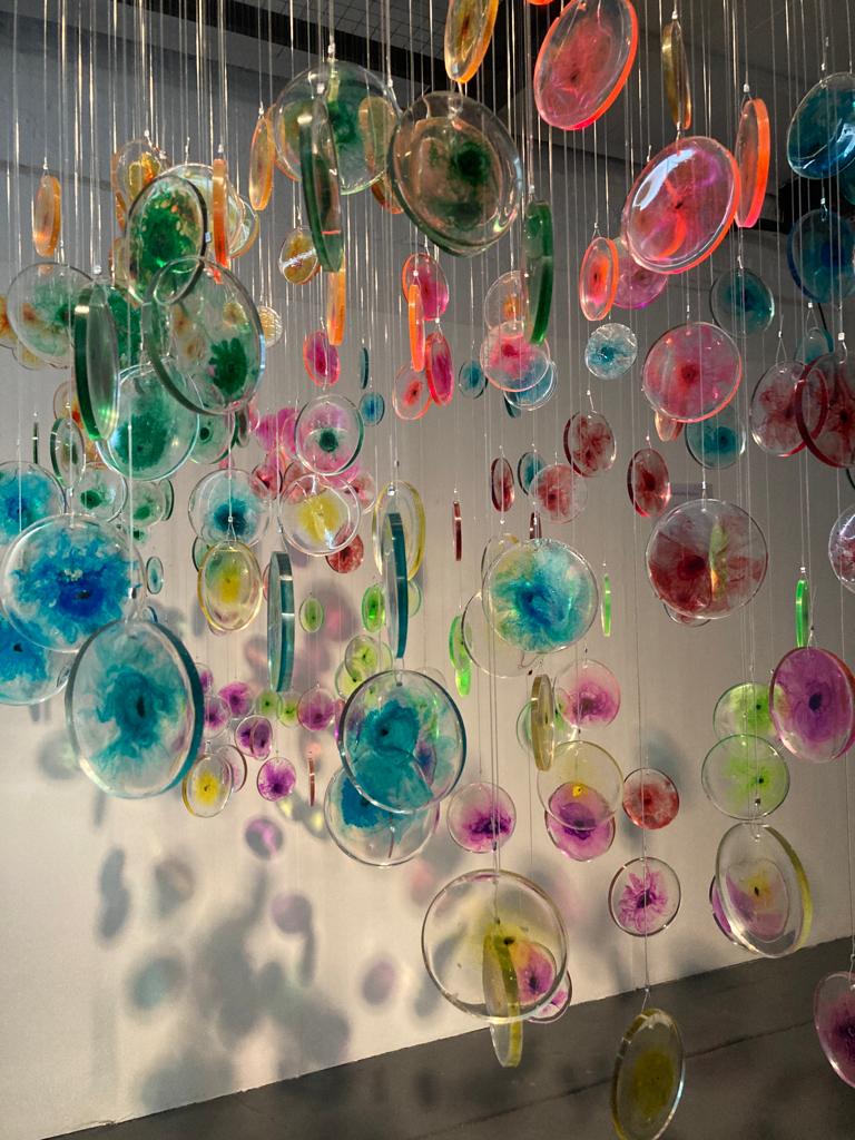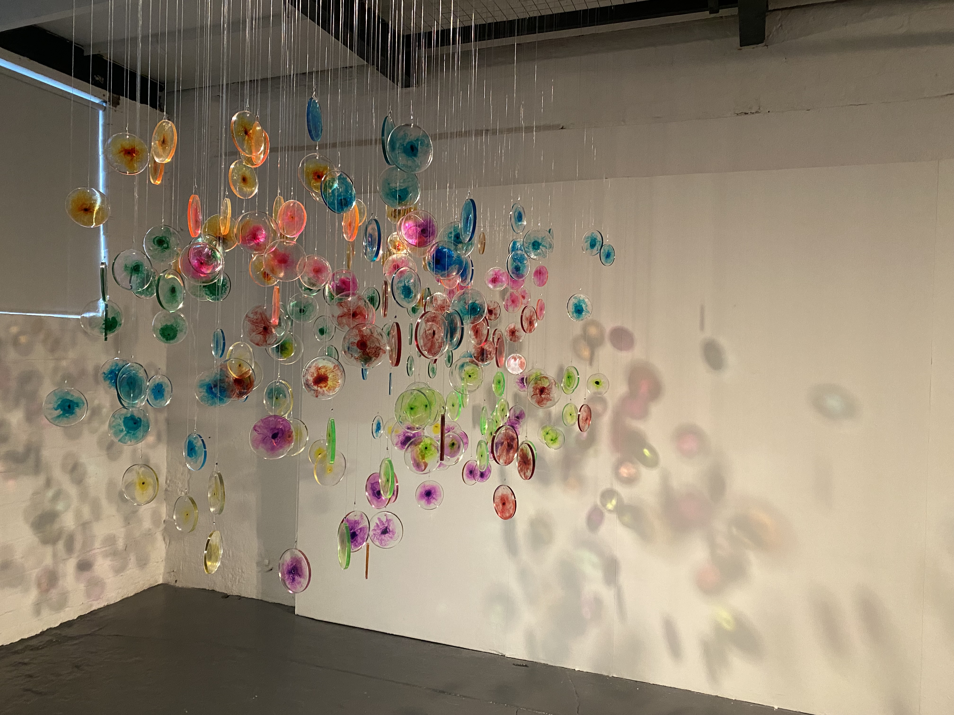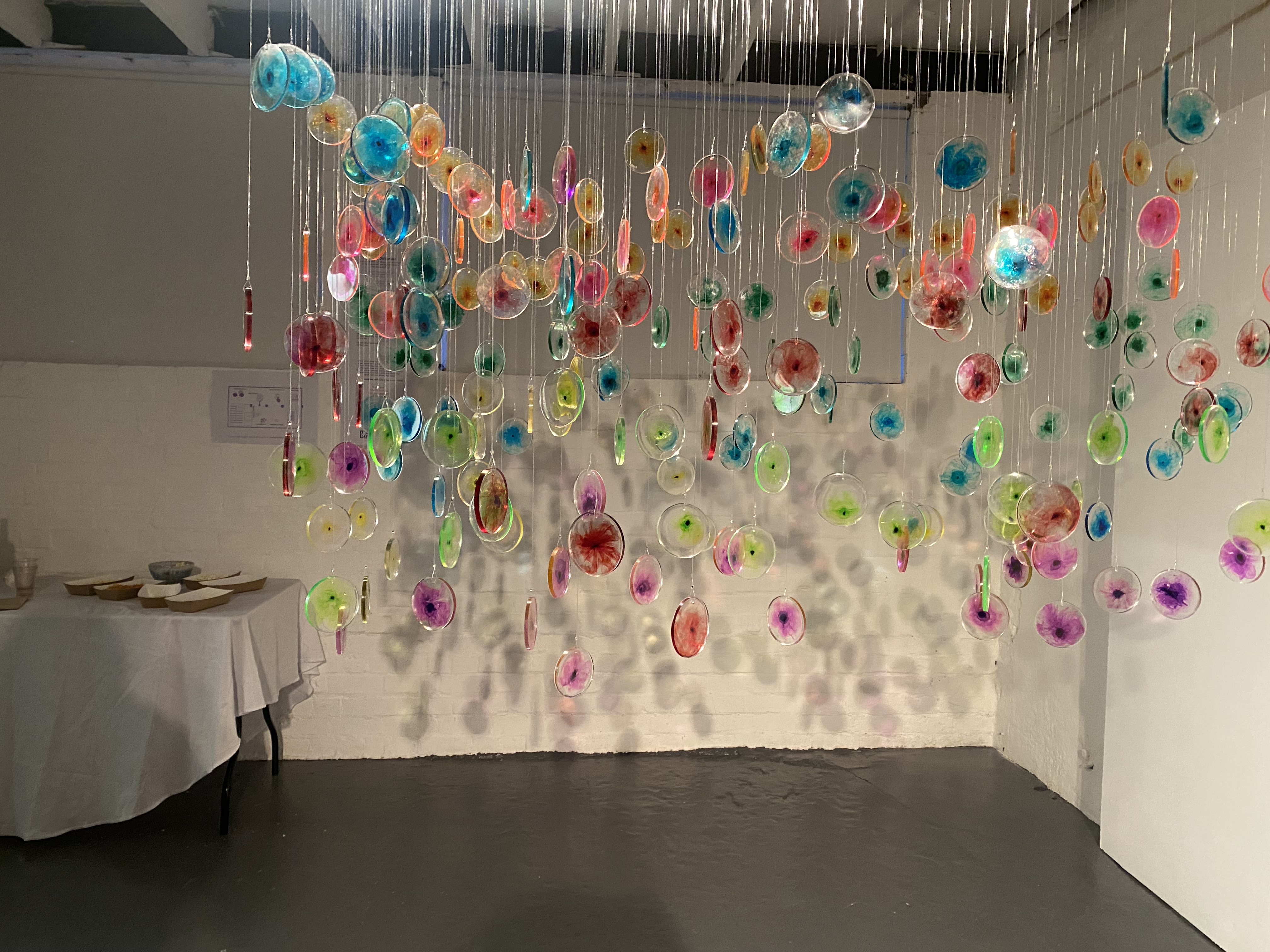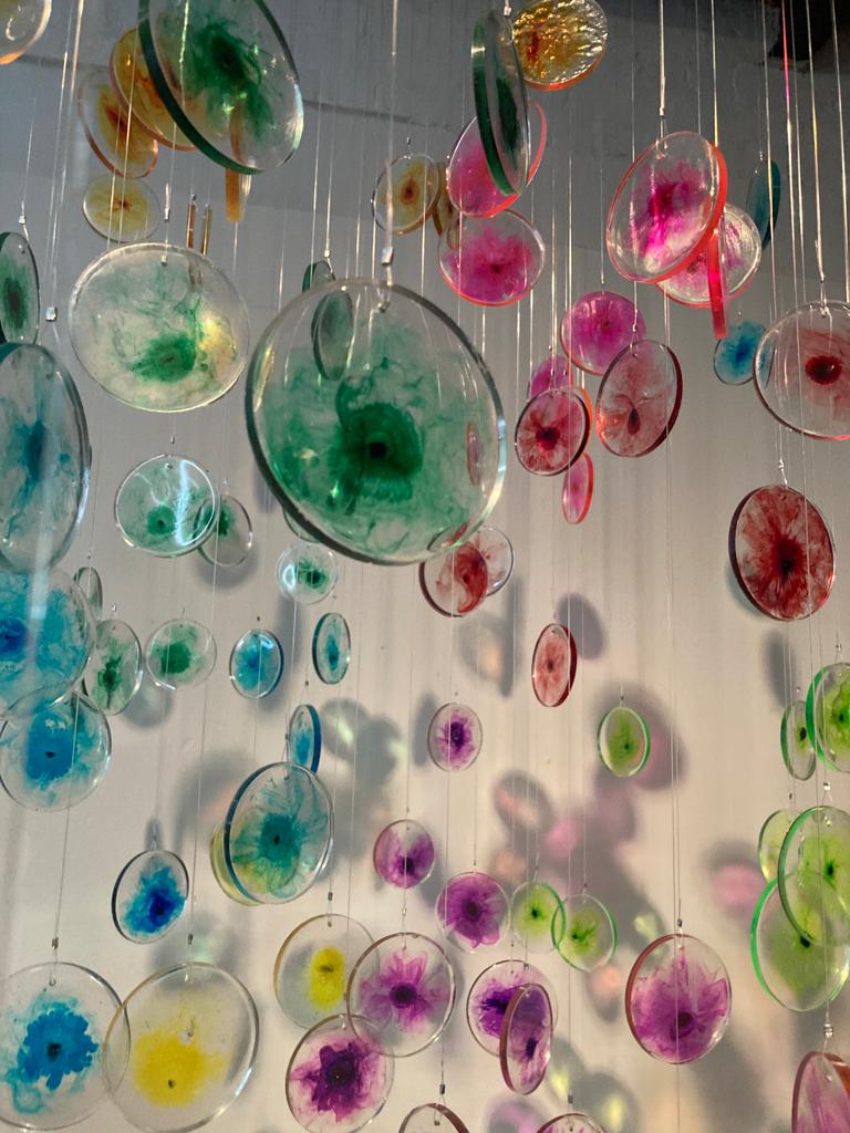 I visited the haematology lab where she was able to observe the flow cytometry technique used to ‘dye’ cells with fluorescent coloured inks prior to them undergoing testing. I was immediately struck by how these brightly coloured formations are used to identify whether someone had or still has leukaemia, yet the patient never gets to view these colourful displays themselves. The new software effectively compresses the visualisations taken from many different patient samples into one cluster of colours or cells that can be used to further improve the way that leukaemia cells are identified. Through their research, I noted the scientists were shifting perspective on the way they look at the results of the testing and it is this compression of the visuals and change of view that she chose to develop further in her work through making fluorescent cells – in the same colour scheme used within the science – that can be hung to reflect clusters and perspective. Face on the cluster gives the perspective of the scientist, viewed perpendicularly we see the individual data points reflecting the individual.