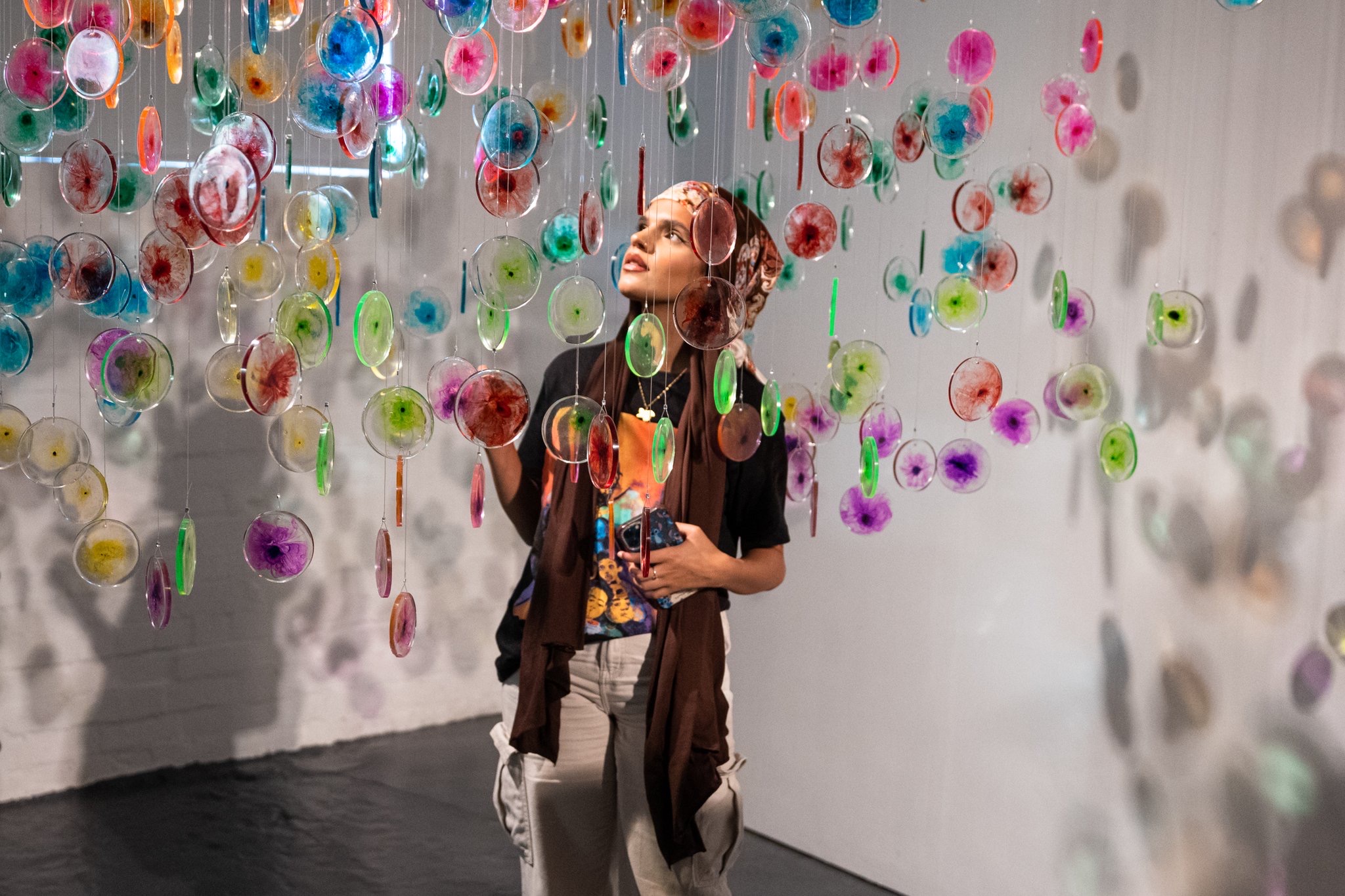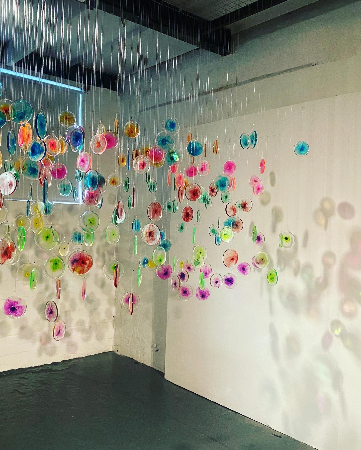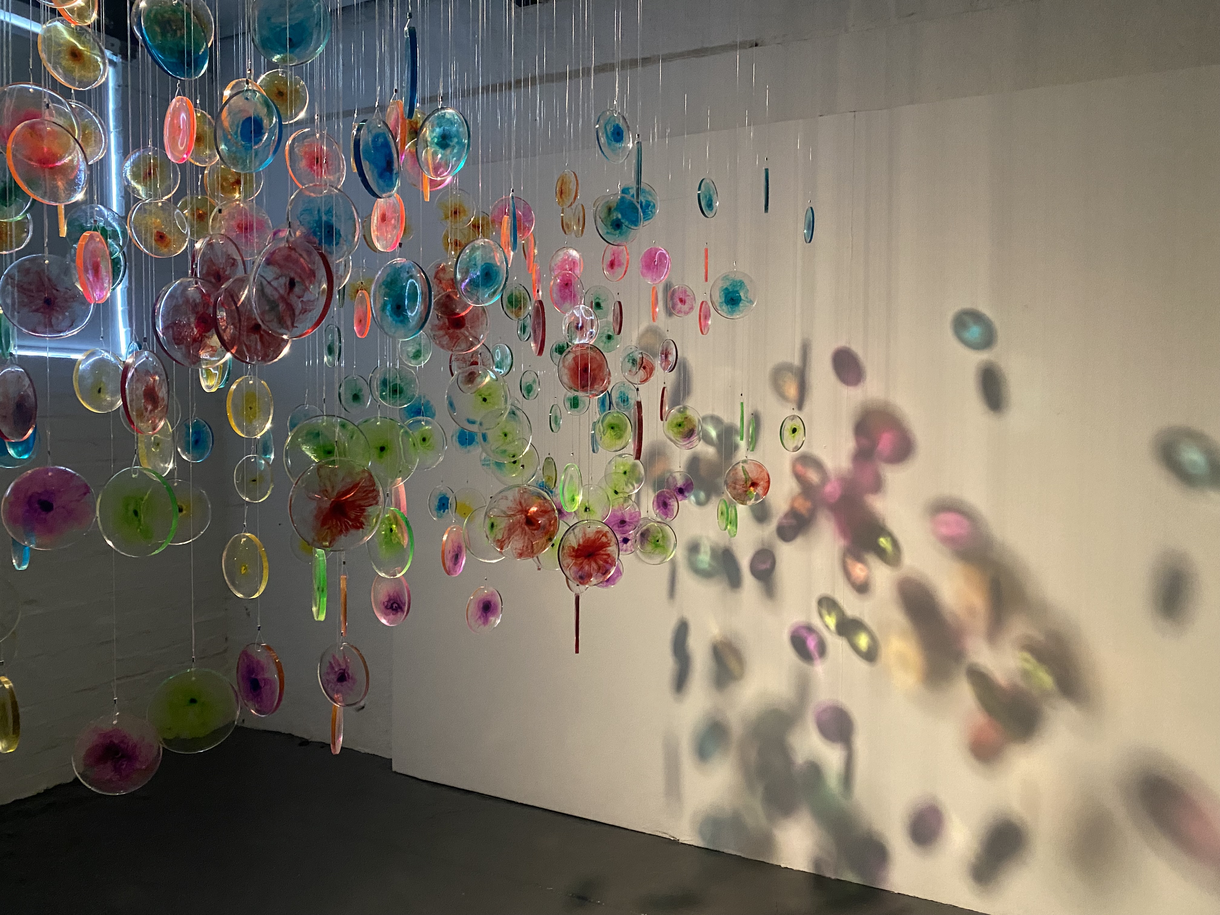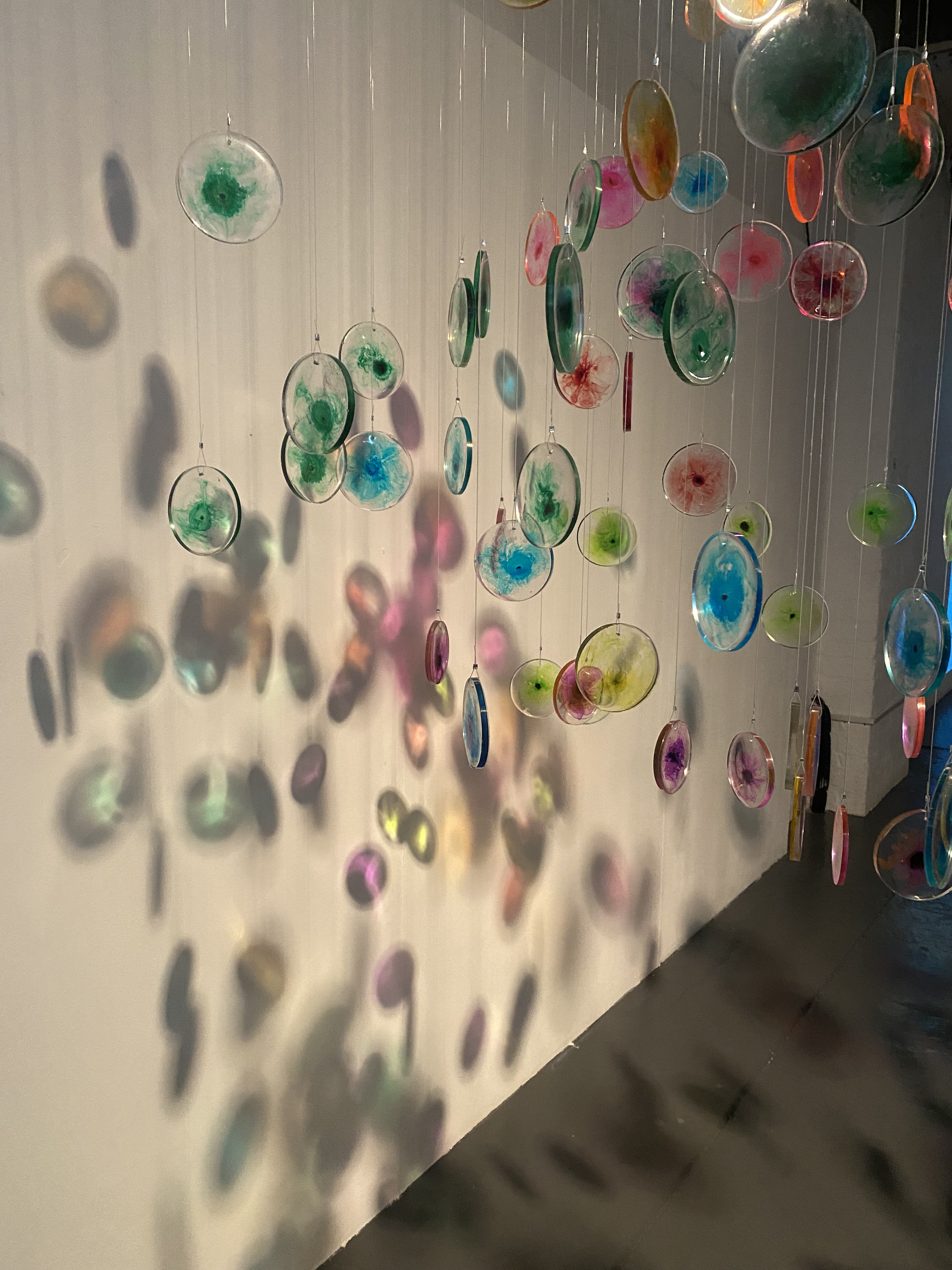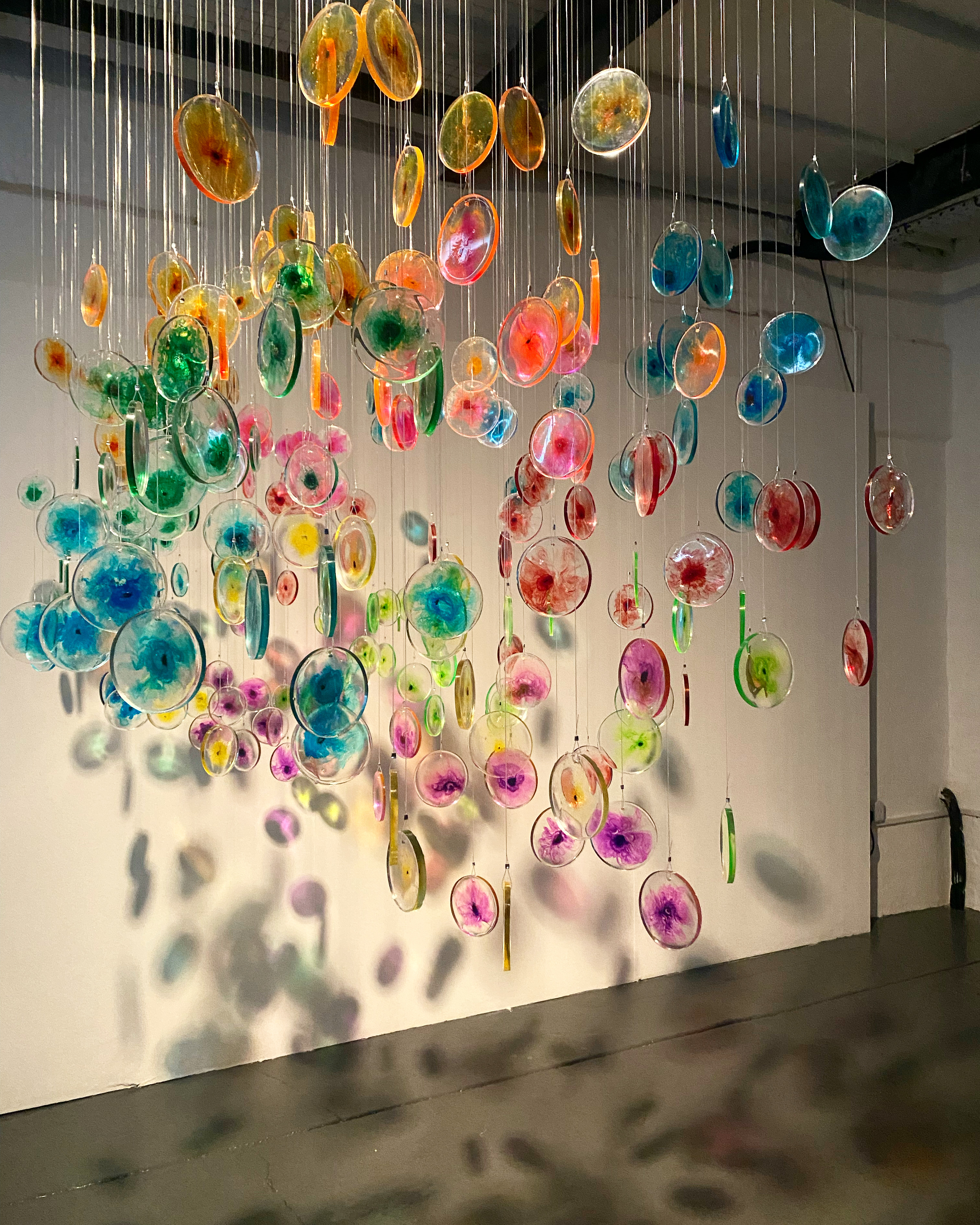 I visited the haematology lab where she was able to observe the flow cytometry technique used to ‘dye’ cells with fluorescent coloured inks prior to them undergoing testing. I was immediately struck by how these brightly coloured formations are used to identify whether someone had or still has leukaemia, yet the patient never gets to view these colourful displays themselves. The new software effectively compresses the visualisations taken from many different patient samples into one cluster of colours or cells that can be used to further improve the way that leukaemia cells are identified. Through their research, I noted the scientists were shifting perspective on the way they look at the results of the testing and it is this compression of the visuals and change of view that she chose to develop further in her work through making fluorescent cells – in the same colour scheme used within the science – that can be hung to reflect clusters and perspective. Face on the cluster gives the perspective of the scientist, viewed perpendicularly we see the individual data points reflecting the individual.